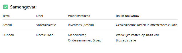 In Bouwflow wordt er een belangrijk onderscheid gemaakt tussen arbeid en uurloon. Beide spelen een rol in de projectcalculatie, maar worden op verschillende momenten en manieren gebruikt: