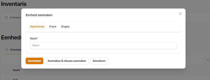 Vervolgens verschijnt er een modaal waar je een nieuwe eenheid kan toevoegen. Hier kan je eenheden in verschillende talen toevoegen.
