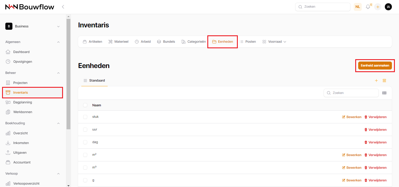 Je kan eenheden toevoegen of beheren door naar Eenheid te gaan en vervolgens op 'Eenheid Aanmaken' te klikken.