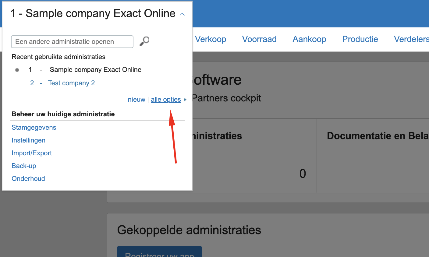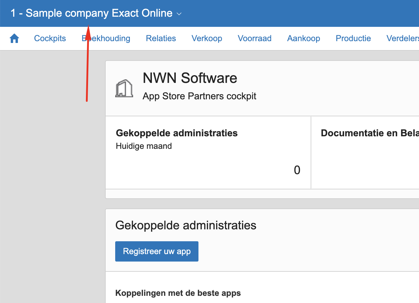 Bouwflow moet weten welke administratie uit Exact Online hij moet gebruiken. Dit wordt aangeduid door een getal. In onderstaande stappen staat uitgelegd waar je dit geval kan vinden.
