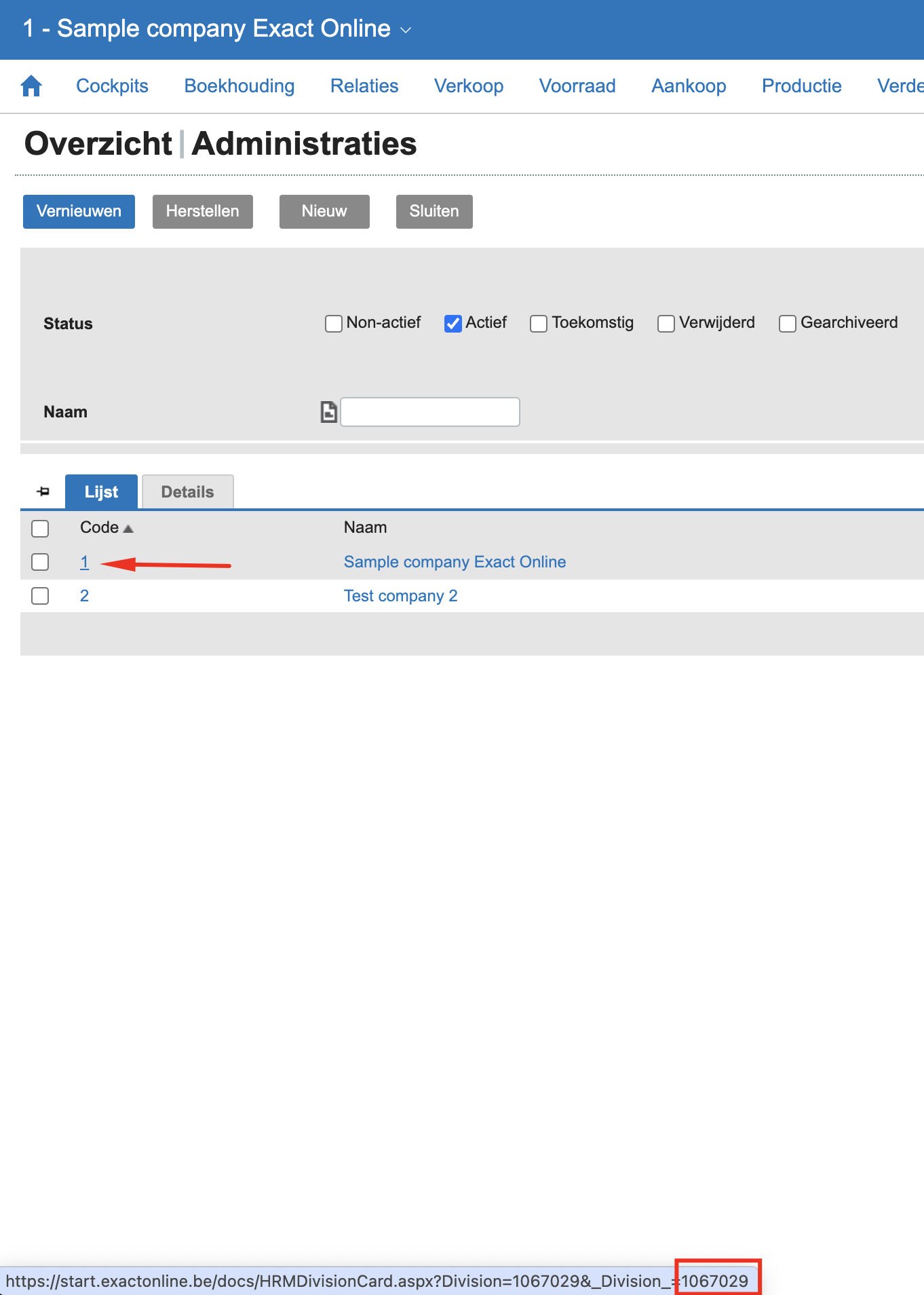 Hier krijg je een lijst te zien met al jouw administraties. Wanneer je je muis over de code van jouw administratie houdt, krijg je onderaan het administratienummer al te zien. In dit geval is dat: 1067029.