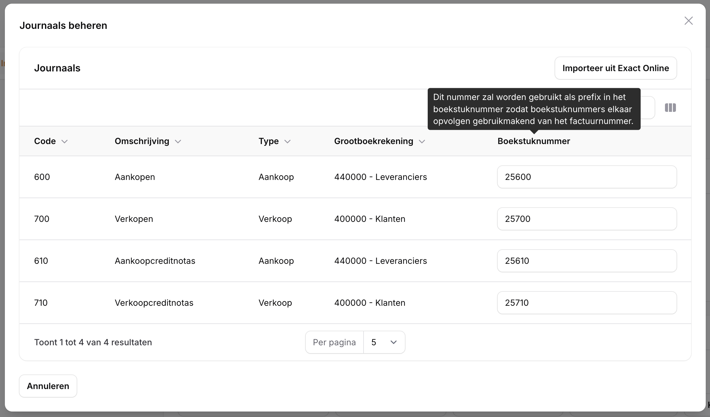 Voor elk journaal dien je hier een boekstuknummer prefix in te geven. Tijdens het doorsturen naar Exact Online gebeurt dan het volgende voor het genereren van het boekstuknummer: Bijvoorbeeld 25700 + 0025 (VF25-0025) = 257000025.