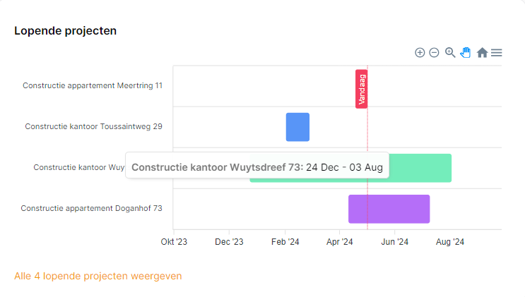 Door met je muis over een blok te gaan zie je de start- en einddatum van het project.