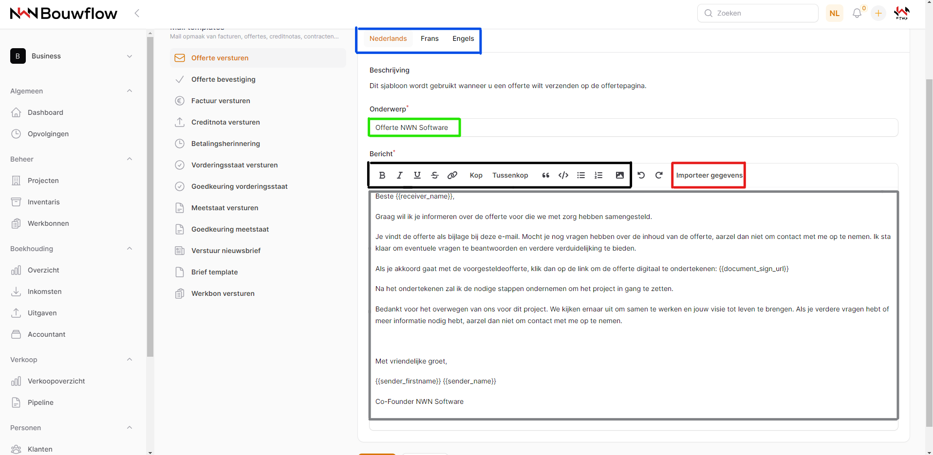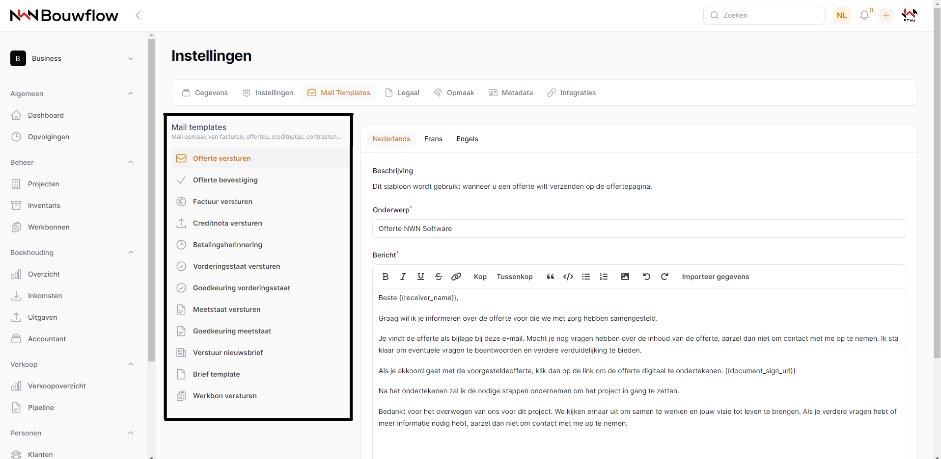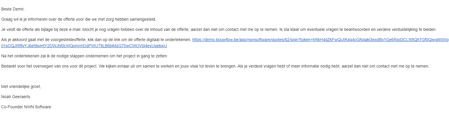 Voor elk document dat met Bouwflow wordt verzonden, is er een e-mailsjabloon. Deze tekst wordt automatisch ingevuld wanneer je een document verstuurt. Hier wordt er uitgelegd hoe je de tekst kan wijzigen die automatisch verschijnt bij het versturen van een e-mail.