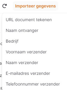 De namen spreken voor zich. Wanneer je hierop klikt, zal Bouwflow automatisch de juiste notatie gebruiken. Bijvoorbeeld, wanneer je klikt op “URL document tekenen” of “Naam ontvanger”, zal Bouwflow dit importeren: