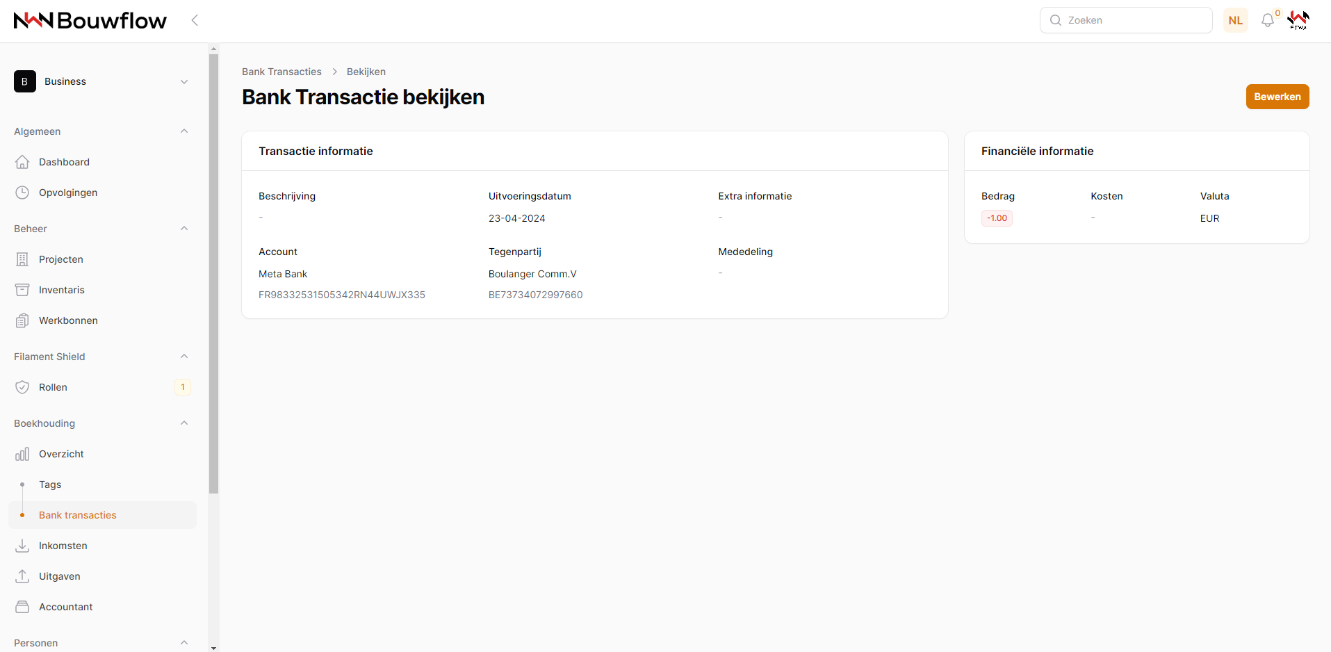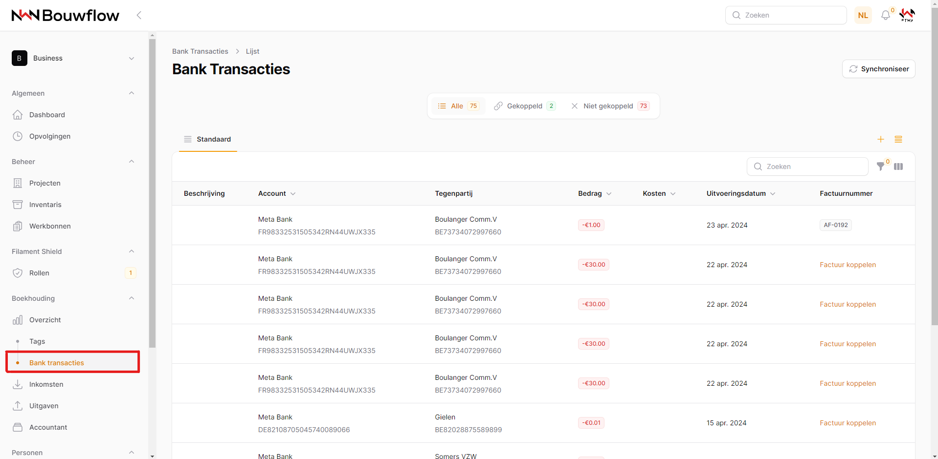 Indien je gebruik maakt van de Ponto-integratie, kan je in het overzicht ook je bank transacties terugvinden. Hier heb je een overzicht van al jouw banktransacties.