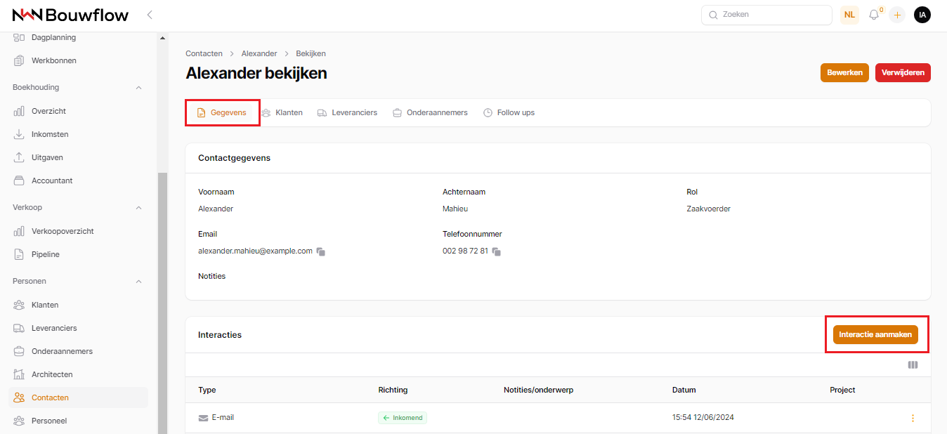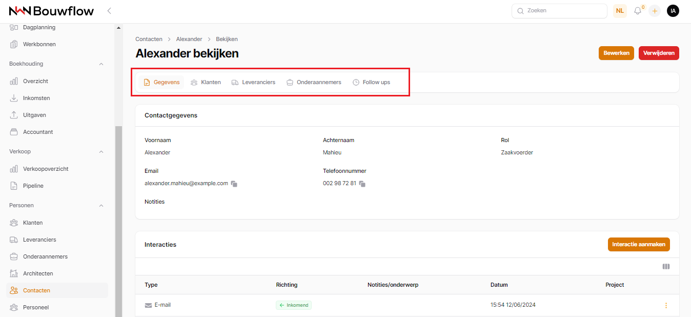 Nadat je een contactpersoon hebt aangemaakt, wordt je doorgestuurd naar het contactprofiel. Hier heb je een snel overzicht van de belangrijkste gegevens. De interacties tussen jou en deze contactpersoon worden onderaan weergegeven.