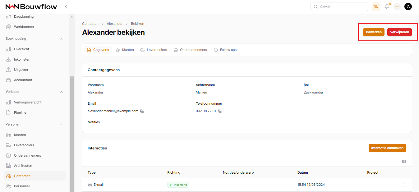Als je een contactpersoon wil bewerken of verwijderen, kan je dit eenvoudig doen door rechtsboven op de knop "Bewerken" of "Verwijderen" te klikken.