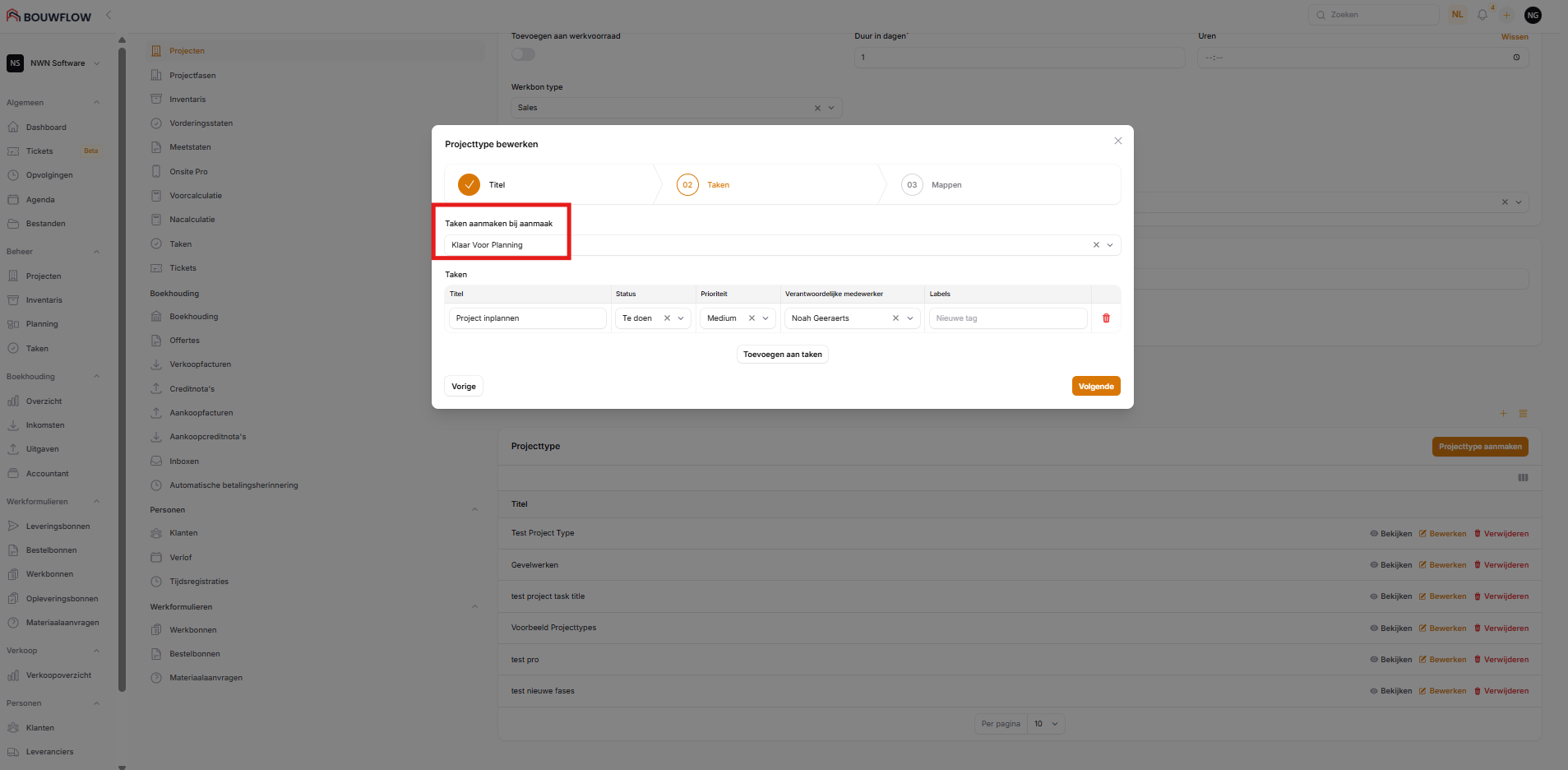 In Bouwflow kun je voortaan zelf bepalen wanneer bepaalde taken automatisch worden aangemaakt in een project. Zo blijft je takenlijst overzichtelijk en sluit deze beter aan bij de echte start van het project. Afhankelijk van de fase van het project, worden de juiste taken gegenereerd.