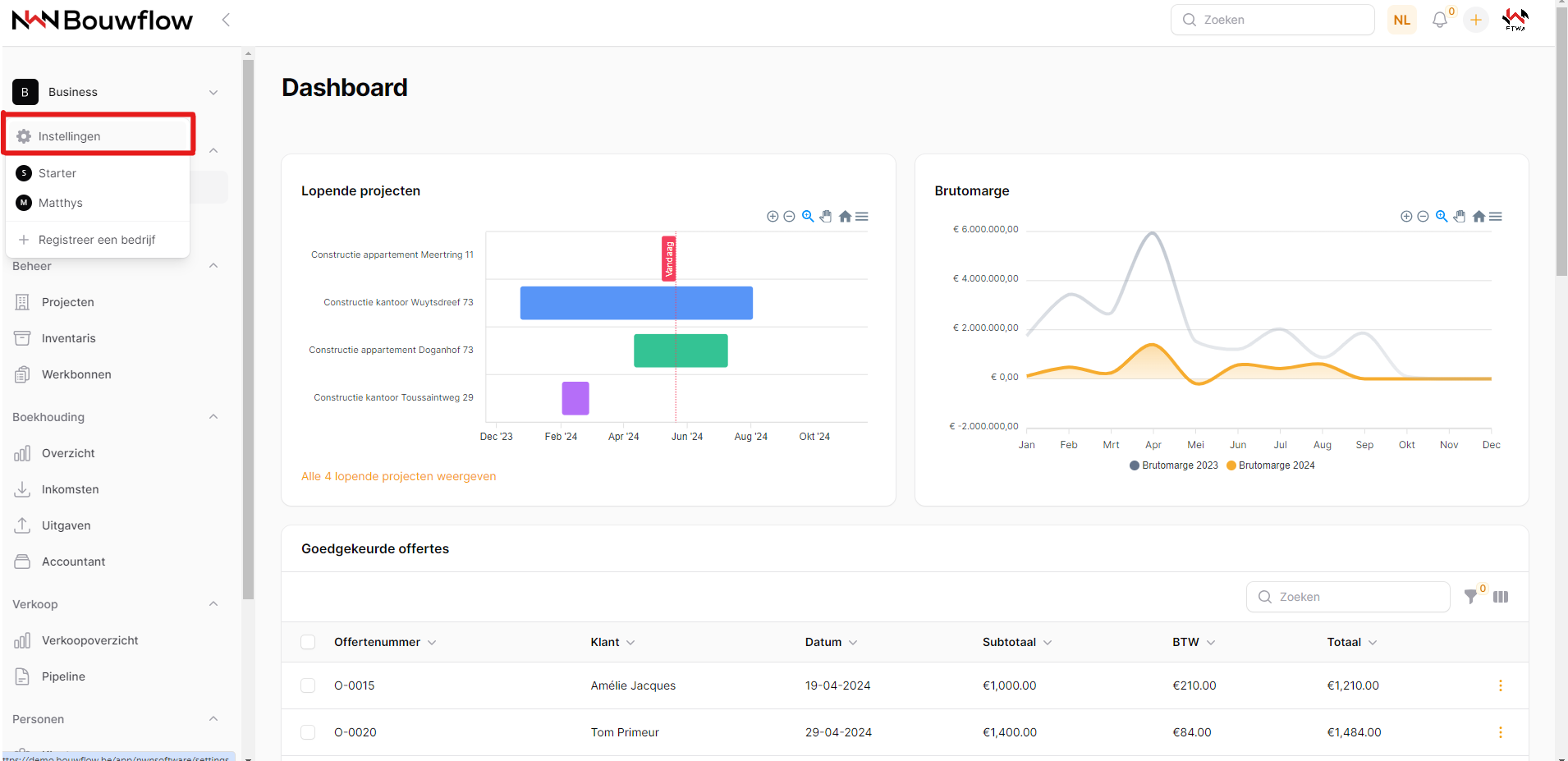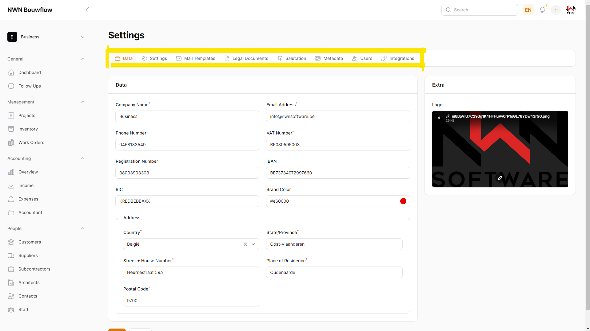 Hier kunnen de instellingen van het bedrijf worden aangepast. Deze instellingen worden gedeeld door alle gebruikers. Je komt op de instellingen pagina terecht door te klikken op jouw bedrijf en vervolgens op instellingen:
