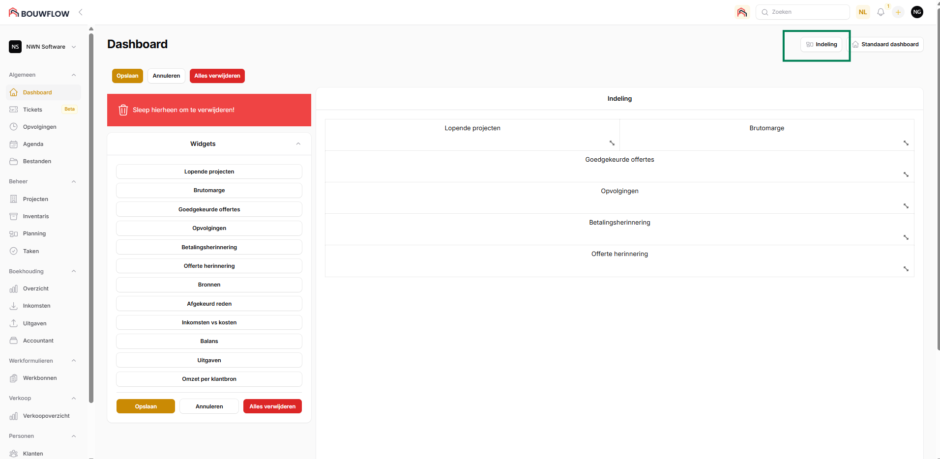 Daarnaast kan je ook zelf jouw eigen dashboard configureren. Dit kan je doen door te klikken op de knop "indeling", en vervolgens de instructies te volgen: